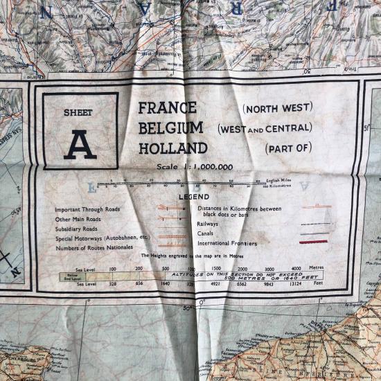 An earlier 1943 series double sided stitched edge silk escape map, 43/A France, Belgium & Holland 43/B France, Spain & German Swiss Frontier. These maps were issued to Allied pilots of the US, RAF, and RCAF. Printed by the company of John Waddington, Ltd,