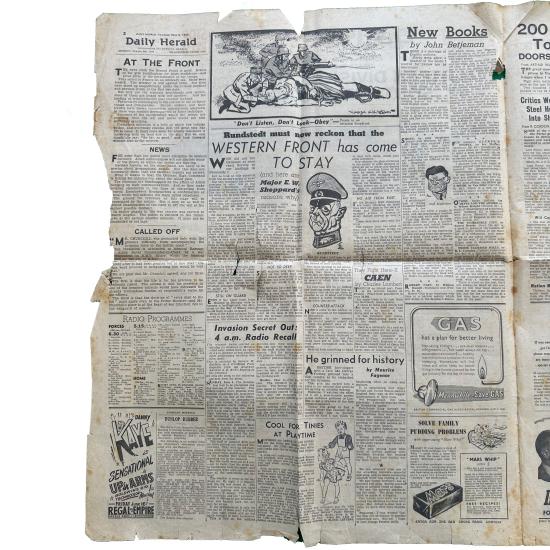 A Daily Herald broadsheet news paper printed on the third day of the Normandy landings. Lots of fascinating articles related to the progress of the invasion as it actually happened. The paper is faded, a little tatty and fragile but unlike so many others out there, it is original and would be ideal for mounting and framing for display.