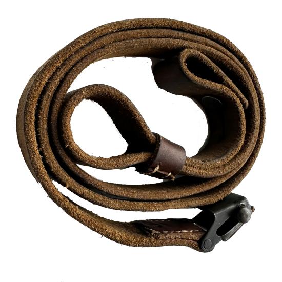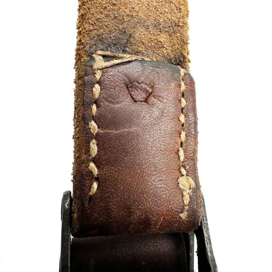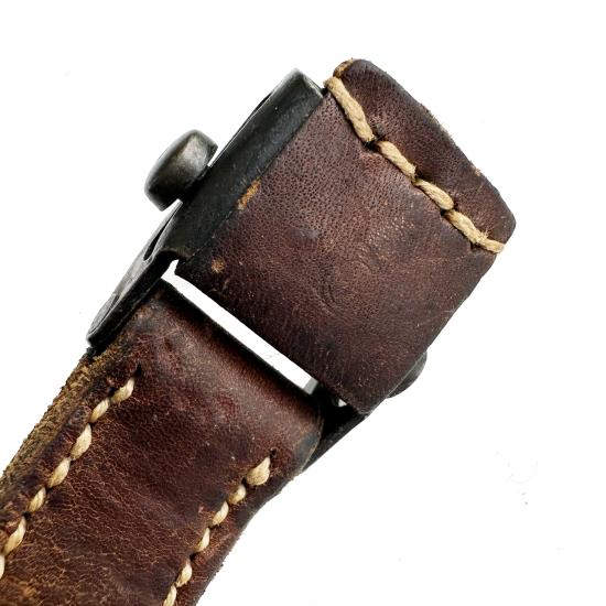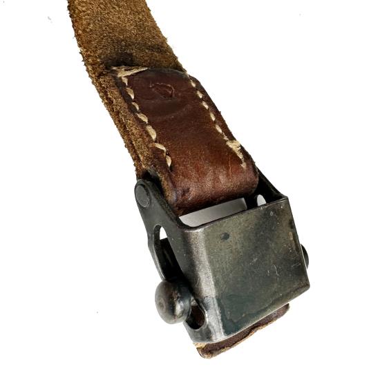 Great example of a leather MP40 sling. The leather has a beautiful patina that can only be obtained through years of wear. The belt has a very feint RZM mark due to wear. The buckle still retains its leather sheath on top.
